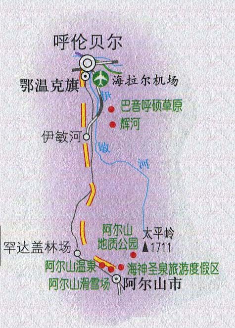 呼伦贝尔至阿尔山滑雪场旅游路线图