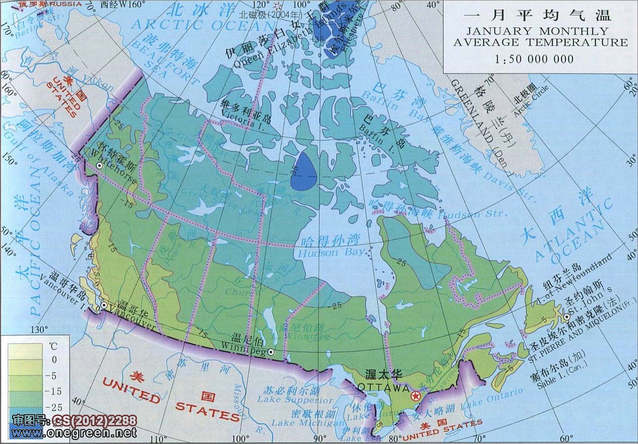 | 加拿大一月平均气温地图 | 审图号:GS(2012)2288 | 分类:加拿大 人气:(载入中...) 更新:2017/11/12 |